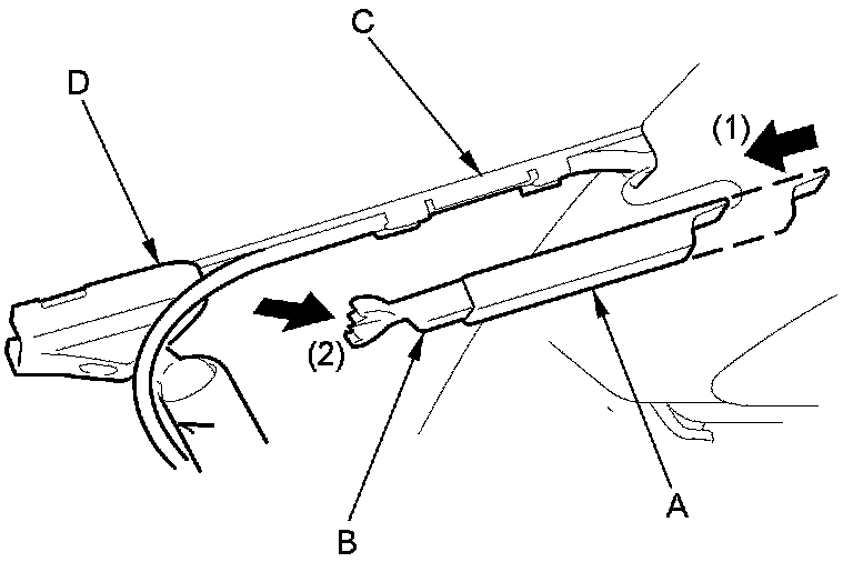 2. Slide the rearview mirror harness upper cover (A) forward, then remove the mirror harness cover (B) from the mirror harness cover base (C) and mirror base (D).