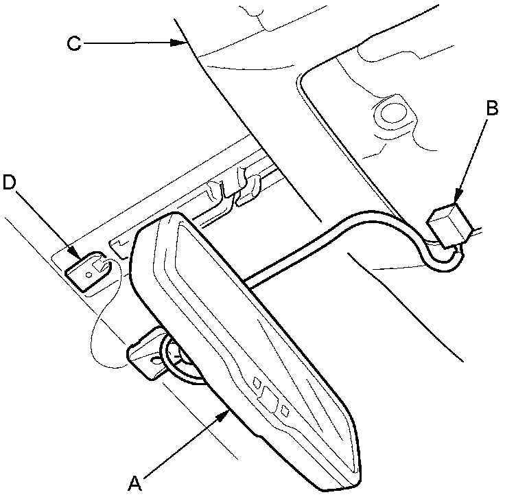 4. While holding the rearview mirror (A), pull out the mirror harness connector (B) through the headliner (C), then slide the rearview mirror rearward and off the mount (D).