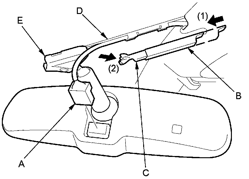 2. Slide the rearview mirror harness upper cover (B) forward, then remove the mirror harness cover (C) from the mirror harness cover base (D) and the mirror base (E).