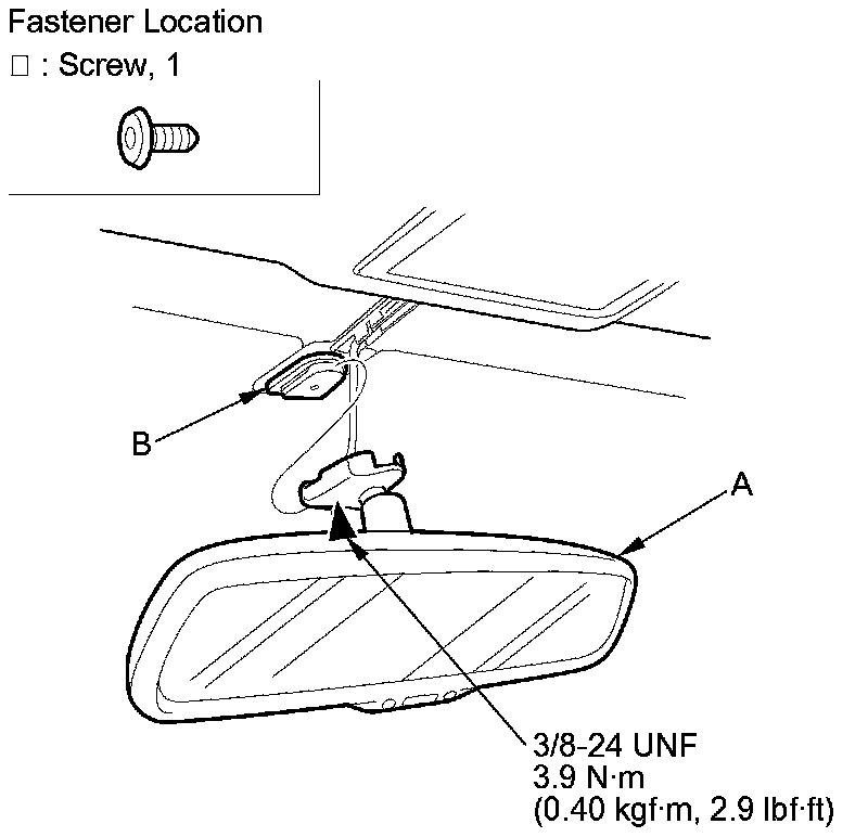 3. Loosen the TORX screw with a TORX T20 bit, then slide the rearview mirror (A) rearward and off the mount (B).