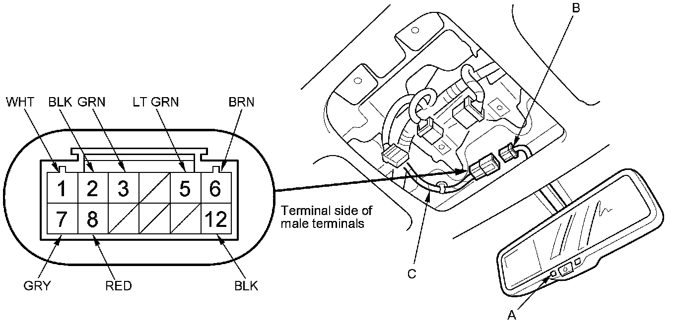 5. Disconnect the 12P connector (B) from the roof wire harness (C).