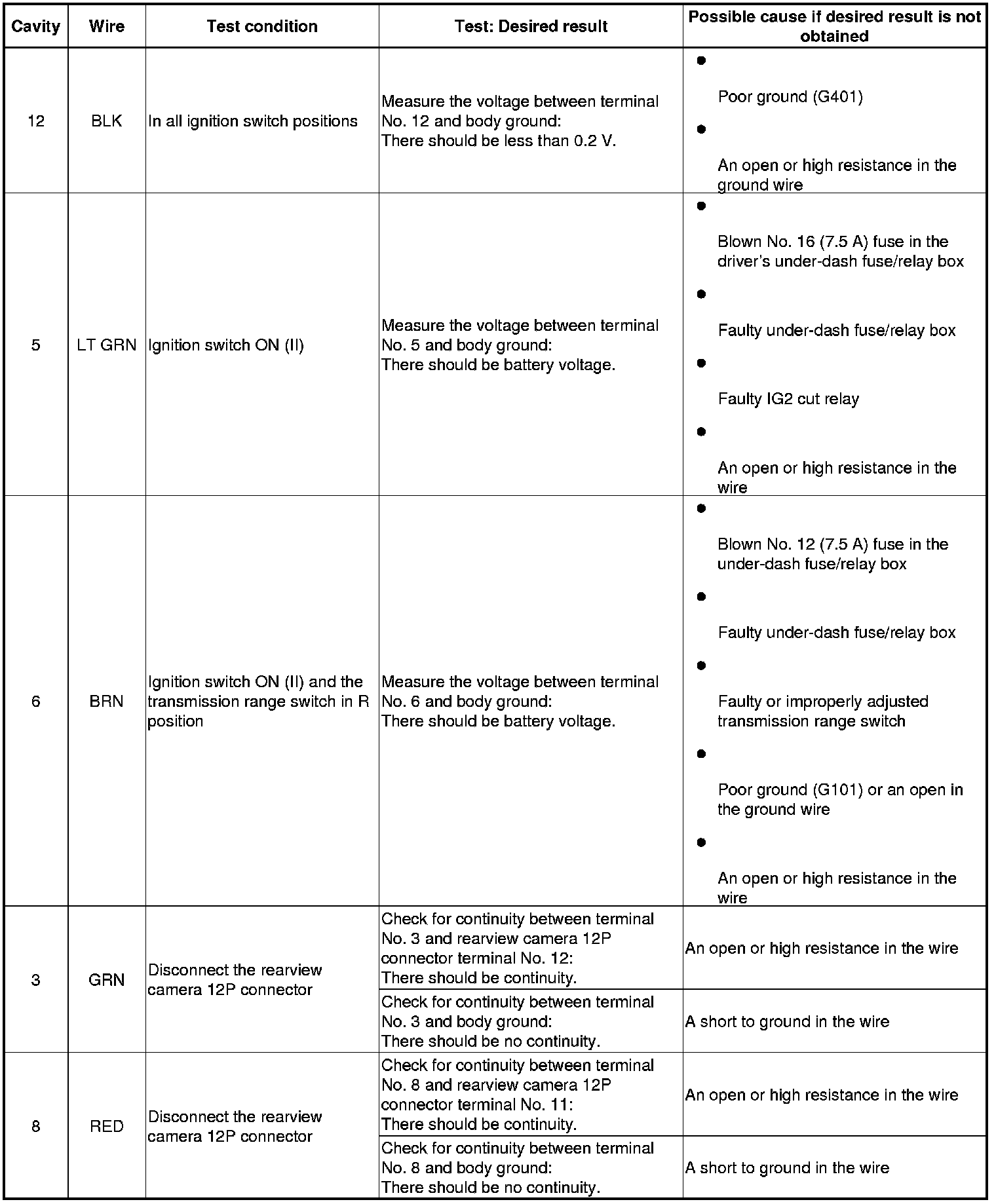 NOTE: Make sure the connector is connected while testing terminals 12, 5, and 6. Make sure the connector is disconnected while testing terminals 3, 8, 2, 1, and 7.