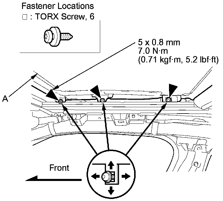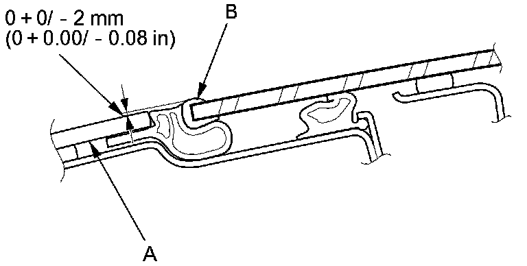 The front fixed glass panel (A) should be even with the edge protector (B), to within 0+0/-2 mm (0+0.00/-0.08 in) along entire edge. If not, make the following adjustment: