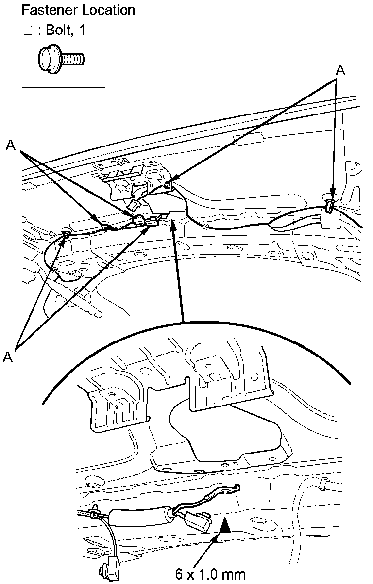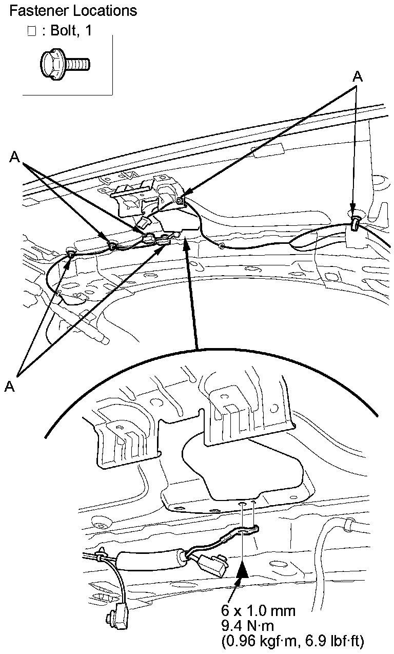 15. Install the harness clips (A) and the ground bolt.