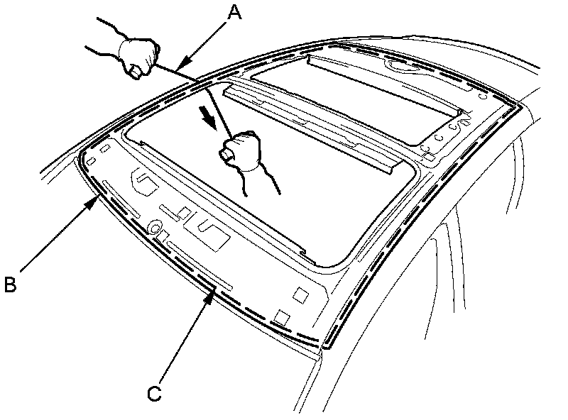 5. With a helper on the outside, pull the piano wire (A) back and forth in a sawing motion. Hold the piano wire as close to the housing (B) as possible to prevent damage to the body. Carefully cut through the adhesive (C) around the entire housing.