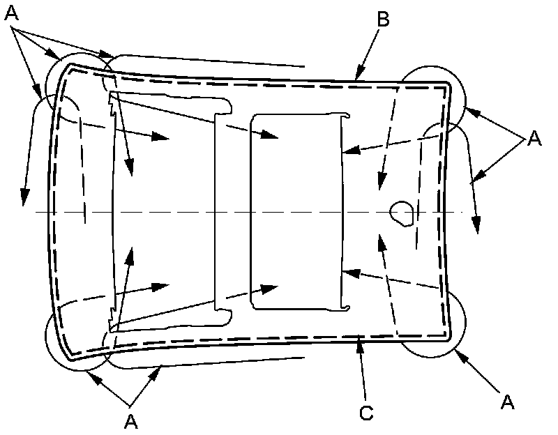 13. Hold the housing over the opening, align the datum pin spacers (A) with the body holes (B), and set it down on adhesive. Lightly push on the housing until the side spacers (C) and the datum pin spacers are fully seated to the body and the housing edges are fully seated on adhesive all the way around.