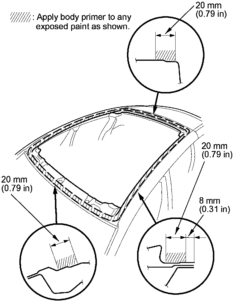 10. Carefully apply a light coat of body primer to any exposed paint or metal around the flange where the new adhesive will be applied. Let the body primer dry for at least 10 minutes: