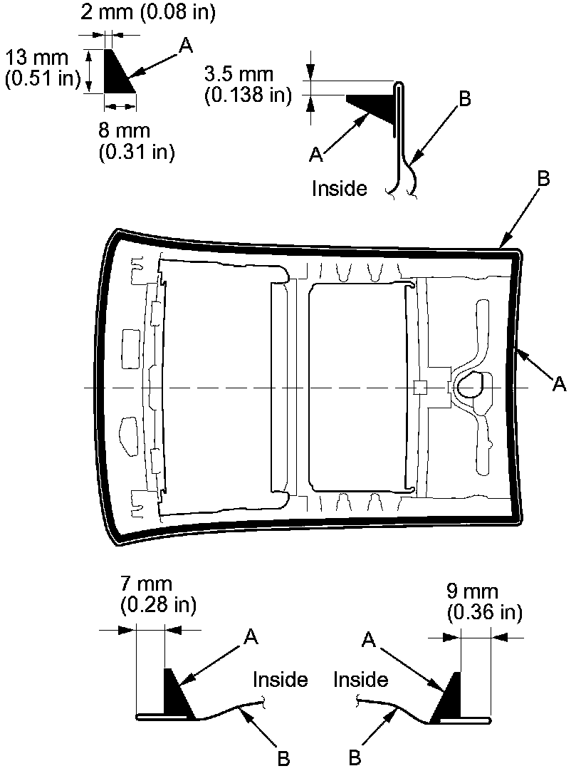 12. Put the cartridge in a caulking gun, and run a continuous bead of the adhesive (A) along the edge of the housing (B) as shown or along the old adhesive path on the body. Apply the adhesive within 30 minutes after applying the body primer. Make a slightly thicker bead at each corner.