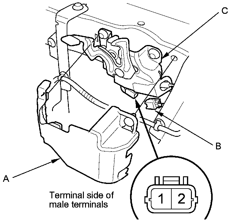 - There should be continuity between terminals No. 1 and No. 2 when the hood is opened (latch released).