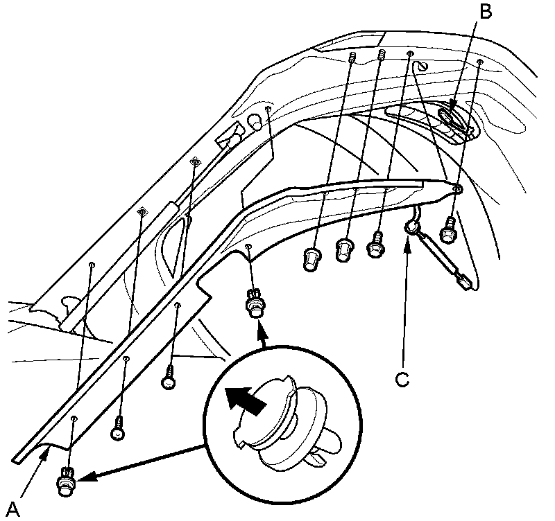 3. Disconnect the 2P connector (B) from the pinch sensor, and remove the grommet (C).