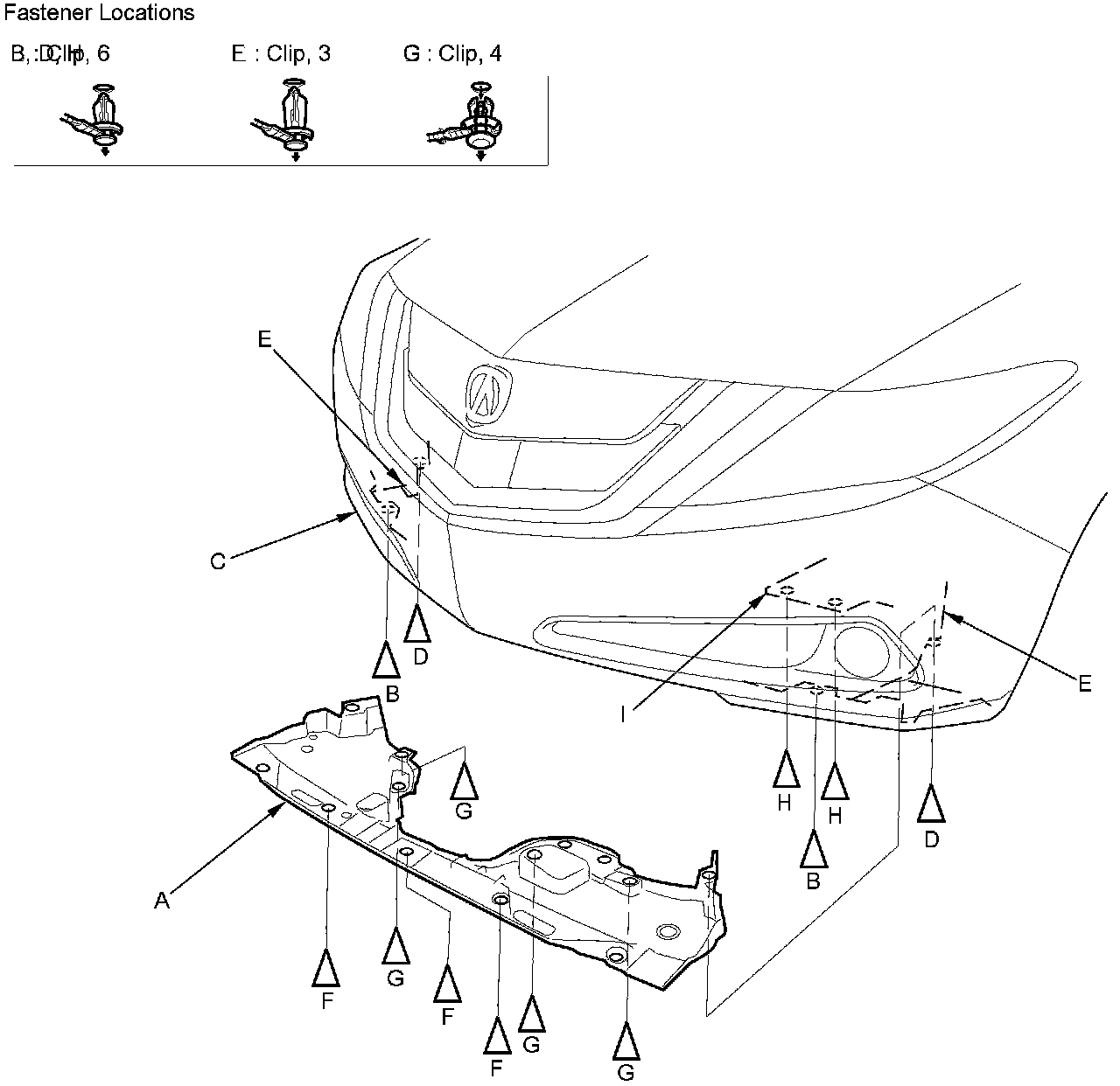 4. Detach the clips (H) securing the engine undercover (I) and the splash shield.