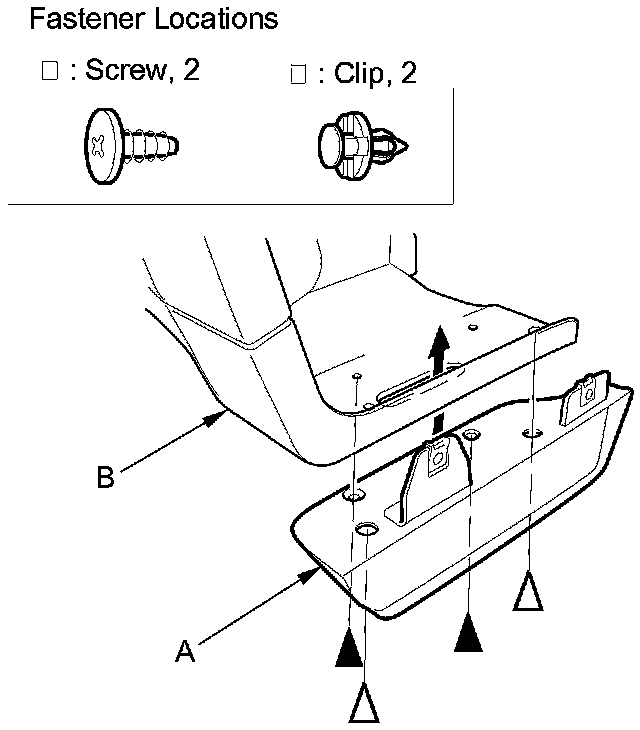 2. Remove the screws and the clips, then remove the rear side sill strake (A) from the rear side sill panel (B).