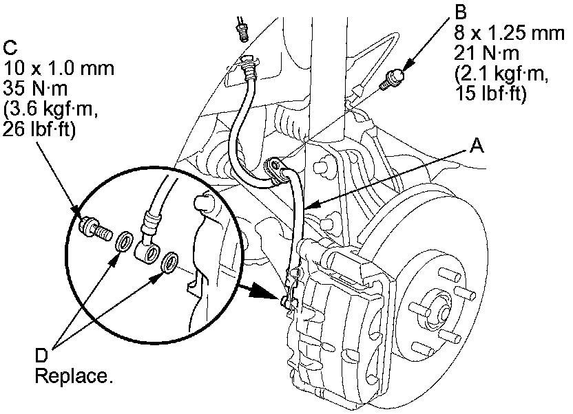 7. Connect the brake hose to the caliper with the banjo bolt (C) and new sealing washers (D).