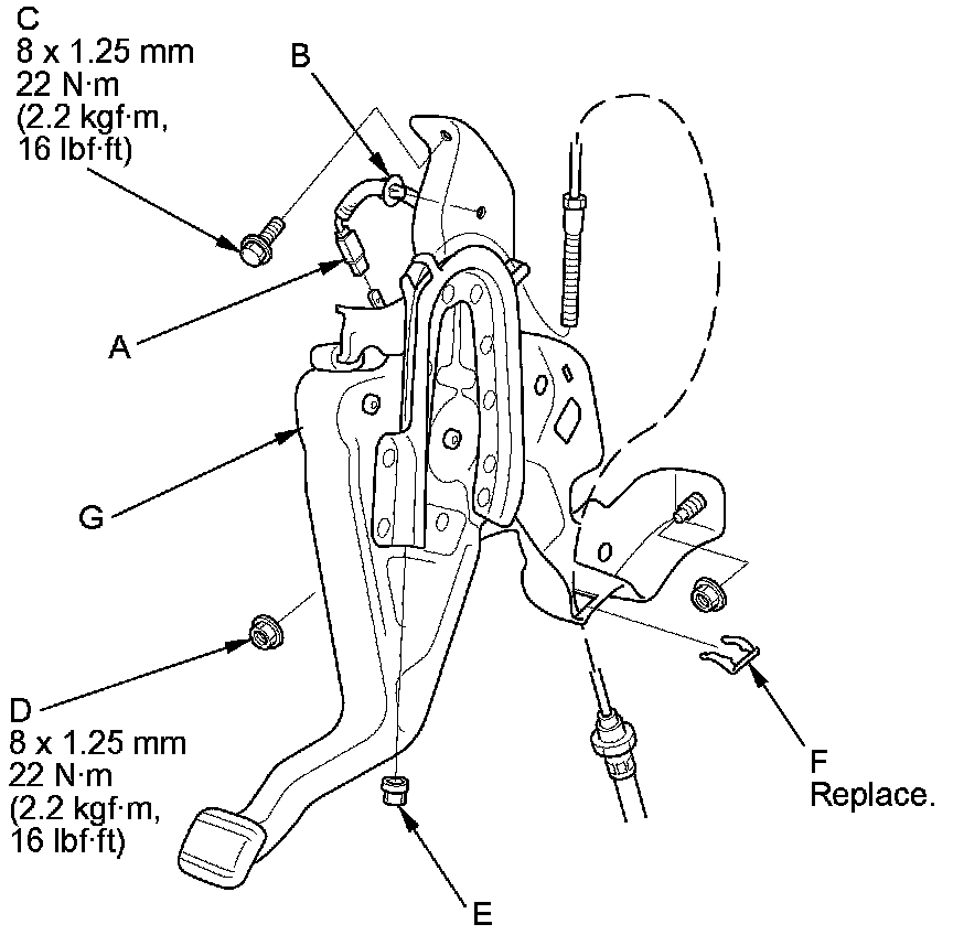 7. Disconnect the parking brake cable from the parking brake pedal assembly (G), and remove the parking brake pedal assembly.