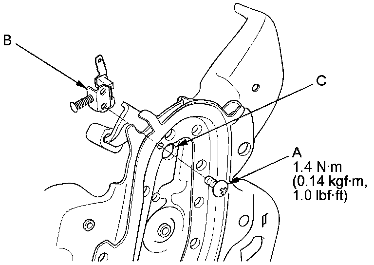 8. Remove the screw (A) from the parking brake switch (B) align the hole (C) with the screw by pressing the parking brake pedal.
