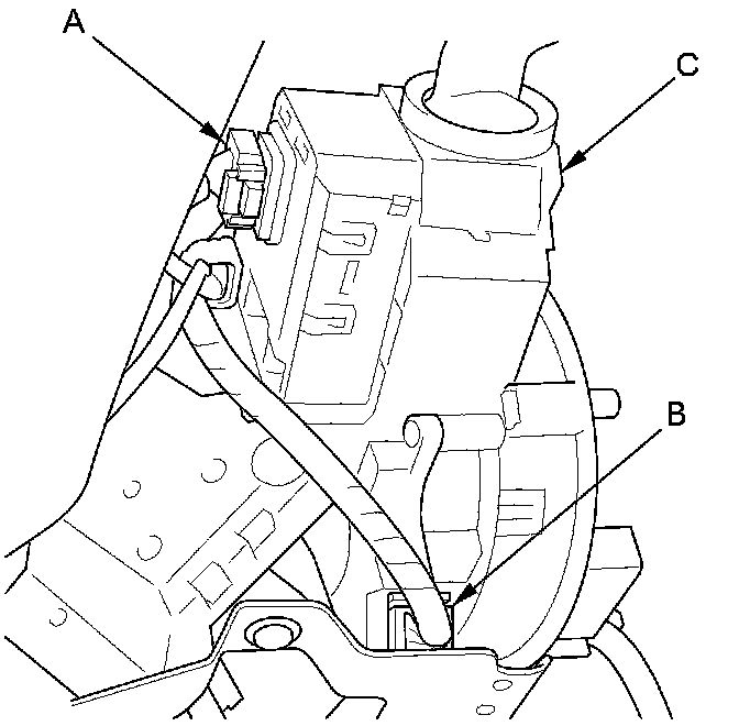 3. Disconnect the combination light switch 12P connector (A) and the steering angle sensor 5P connector (B) from the combination switch assembly/cable reel (C).