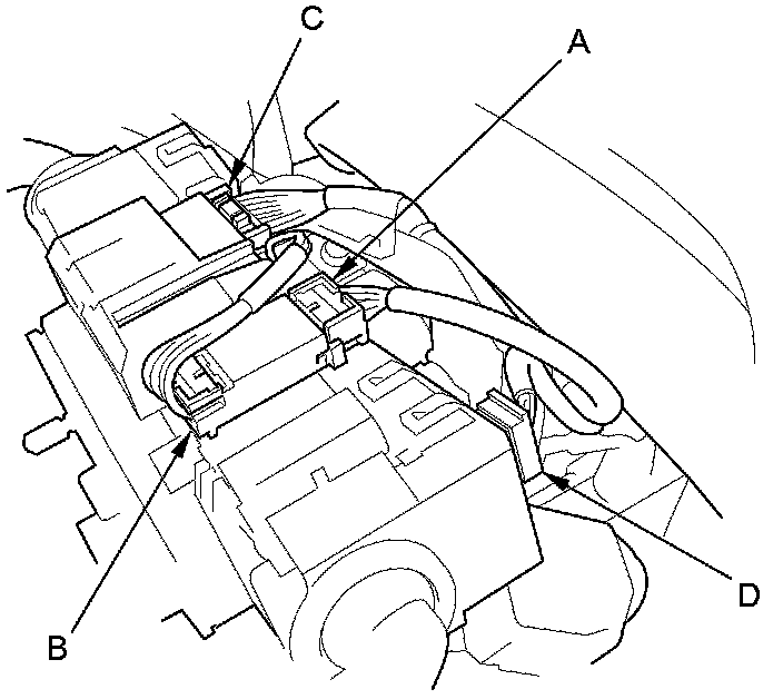 4. Disconnect the dashboard wire harness 4P connector (A) from the cable reel 4P connector (B), then disconnect the dashboard wire harness 20P connector (C) and the wiper/washer switch 8P connector (D).