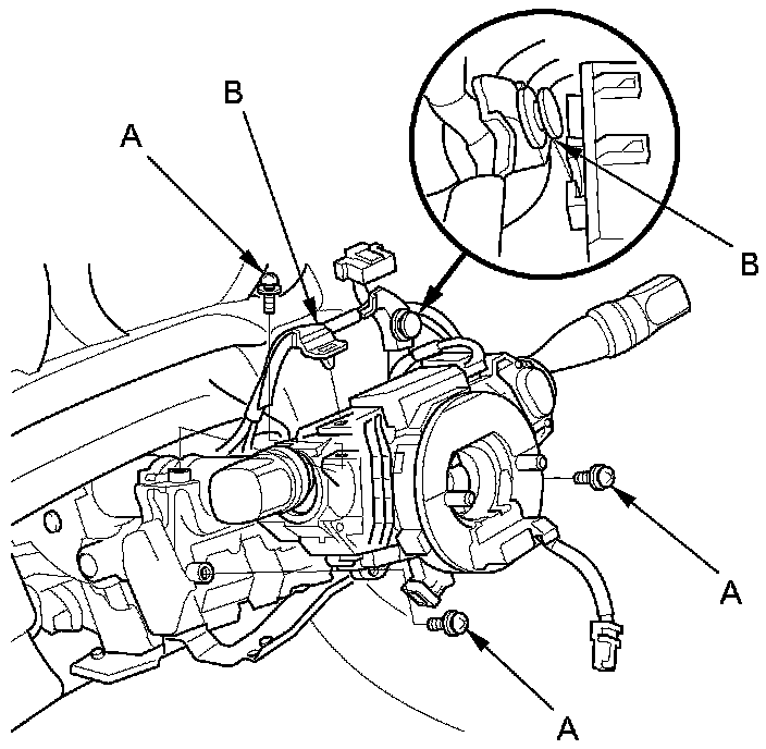 5. Remove the combination switch assembly/cable reel mounting screws (A).