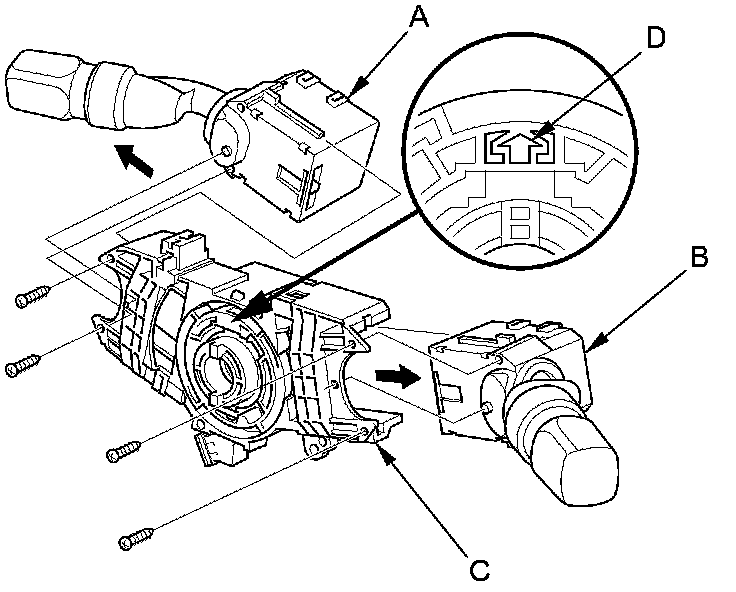 NOTE: When installing the cable reel, set the turn signal canceling sleeve position so that the arrow points (D) straight up.