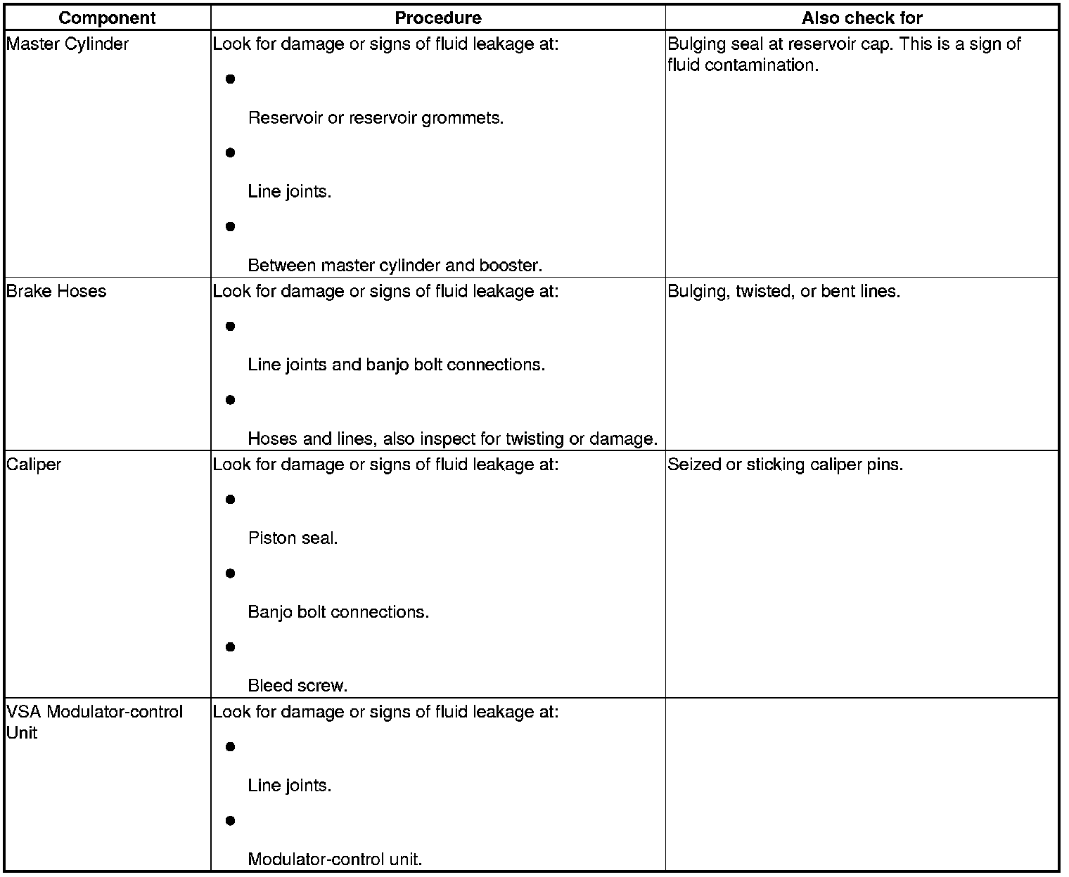 Inspect the brake system components listed. Repair or replace any parts that are leaking or damaged.