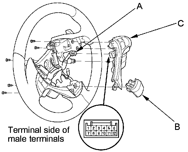 2. Disconnect the cable real subharness connector (A) and the steering wheel center trim (B), then remove the steering wheel trim/cruise control combination switch (C).