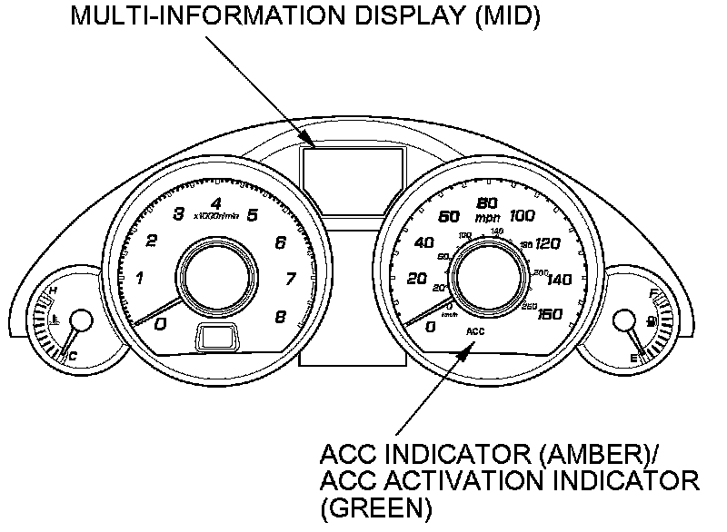When the ACC system is normal, the ACC indicates its operation on the multi-information display (MID) when the MAIN switch is ON.