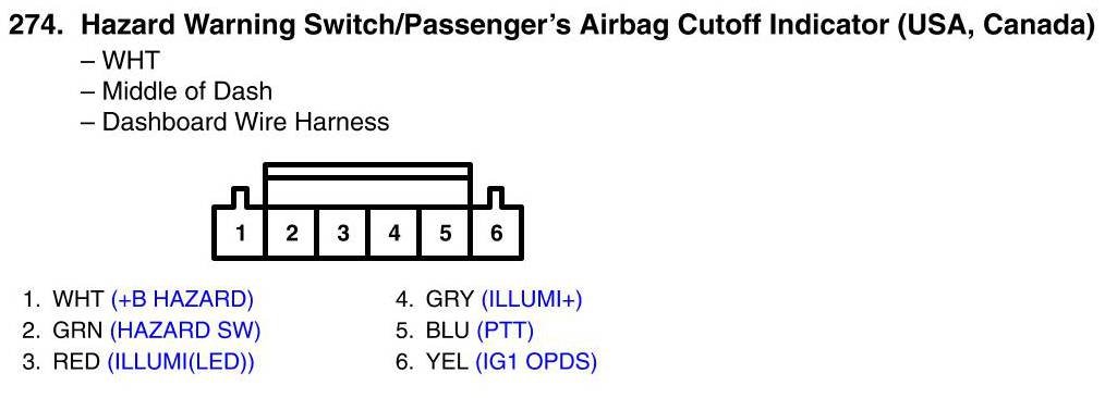 View 274 - Hazard Warning Switch/Passenger's Airbag Cutoff Indicator Connector View (USA, Canada)