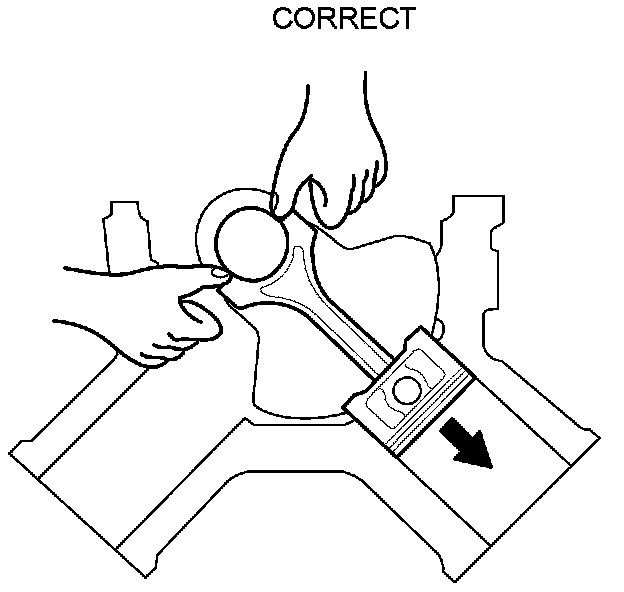 10. Remove the connecting rod caps after setting the connecting rod journal at bottom dead center (BDC) for each cylinder. Remove the piston/connecting rod assembly by pushing on the connecting rod. Take care not to damage the oil jets, the connecting rod journal, or the cylinder with the connecting rod.