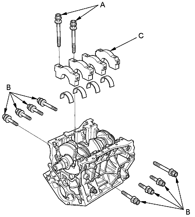 16. Remove the bearing cap bolts (A) and the bearing cap side bolts (B), then remove the main bearing caps (C).
