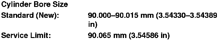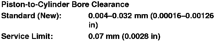 7. Calculate the difference between the cylinder bore diameter and the piston diameter. If the clearance is near or exceeds the service limit, inspect the piston and the cylinder bore for excessive wear.