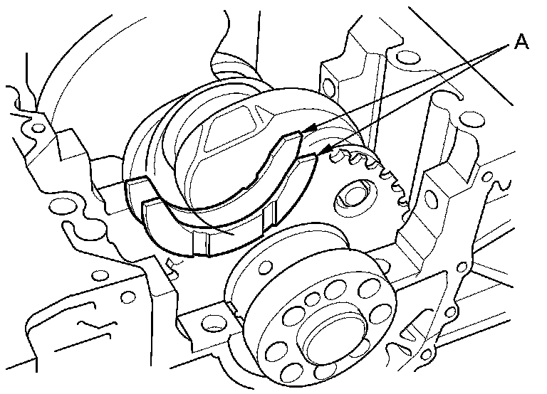 - Apply a 2.5 mm (0.098 in) diameter bead of liquid gasket along the broken line (A).