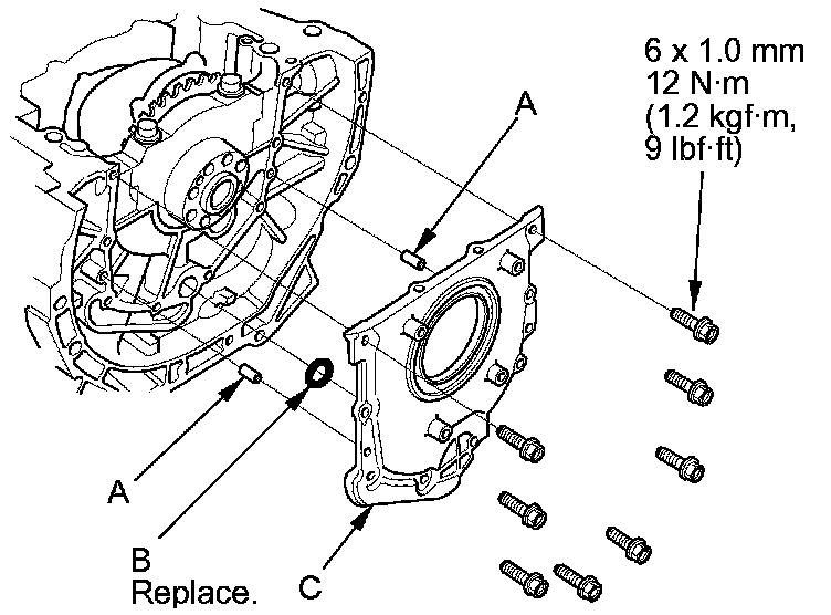 29. Install the dowel pins (A), a new O-ring (B), and the engine block end cover (C) on the engine block.