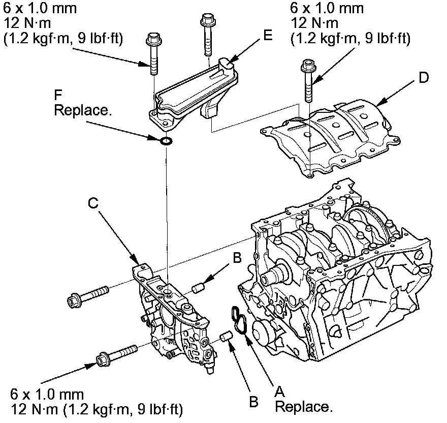 38. Install the baffle plate (D), then install the oil strainer (E) with a new O-ring (F).