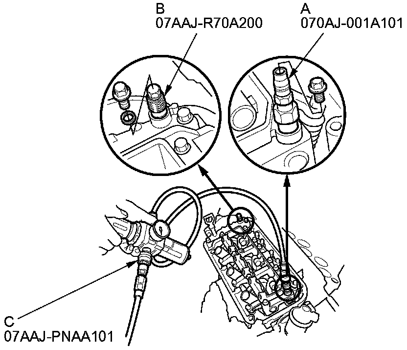 8. Remove the sealing bolts, then install VTEC air stop tool A and the VCM air adapter (B) to the inspection hole, then connect the air pressure regulator (C) as shown.