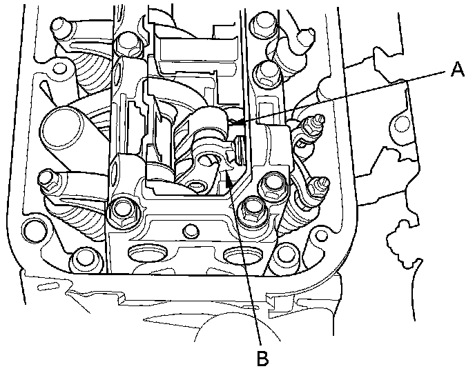 4. Rotate the crankshaft pulley clockwise, and visually check all the intake primary rocker arms (A) and the intake secondary rocker arms (B) moves independently.