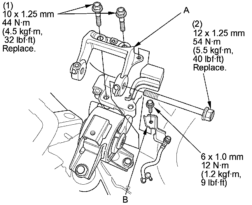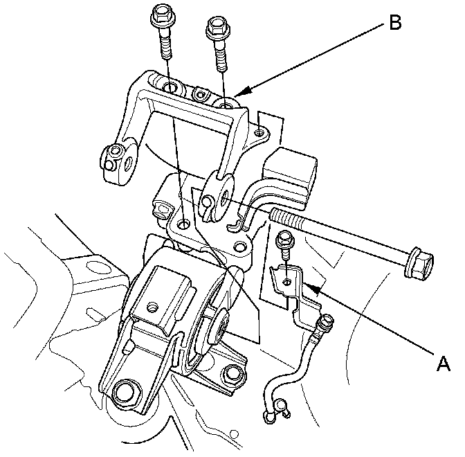 6. Remove the ground cable bracket (A), then remove the upper half of the side engine mount bracket (B).