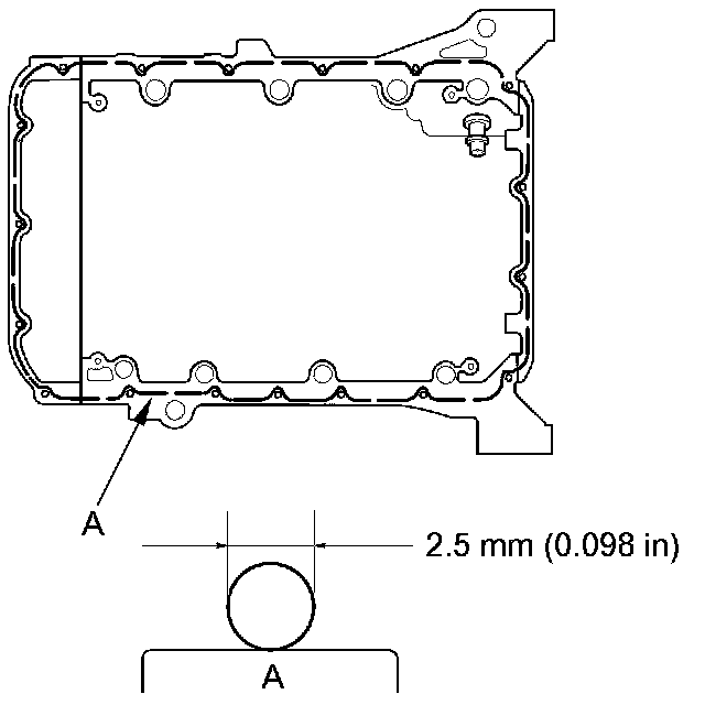 - Apply a 2.5 mm (0.098 in) diameter bead of liquid gasket along the broken line (A).