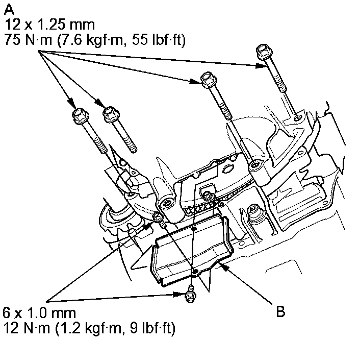 6. Tighten the four bolts (A) securing the transmission, then install the torque converter cover (B).