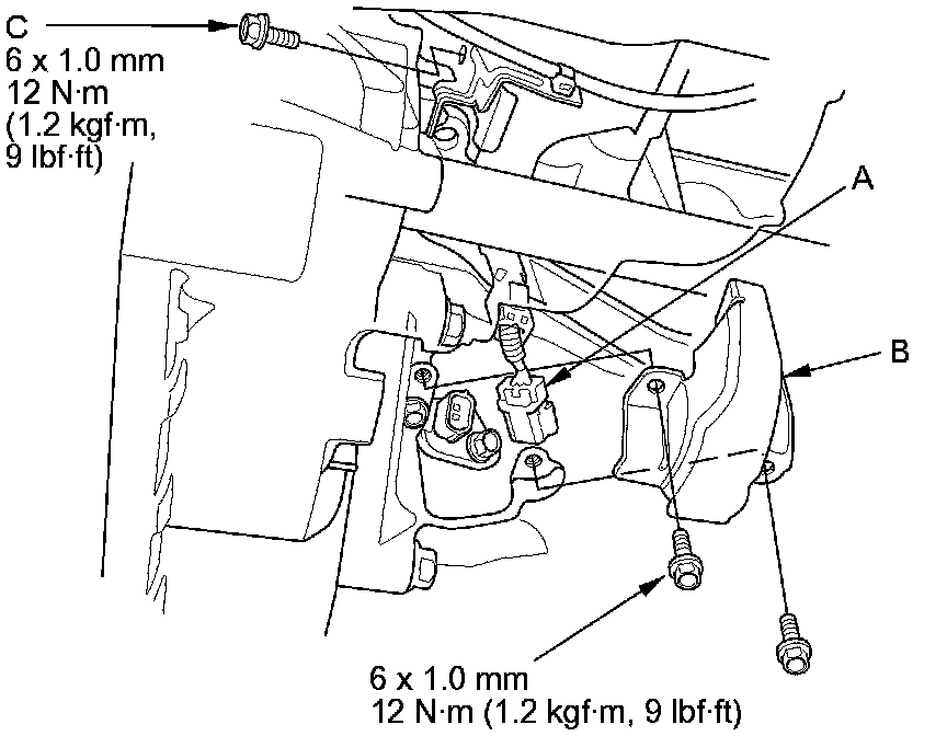 7. Connect the crankshaft position (CKP) sensor connector (A), then install the CKP sensor cover (B) and the bolt (C).