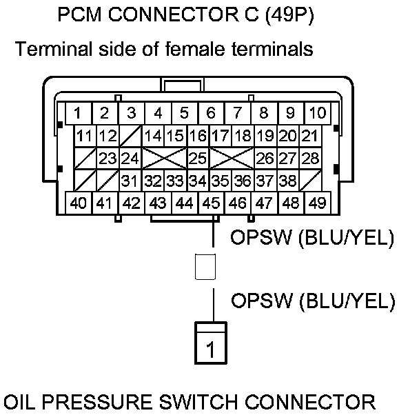 10. Check for continuity between PCM connector terminal C45 and the oil pressure switch connector.