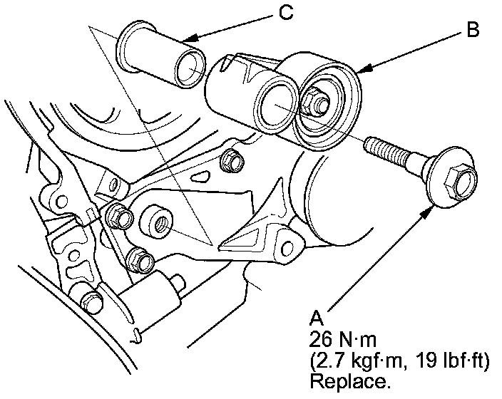 4. Remove the bolt (A), then remove the timing belt adjuster (B) and the collar (C).