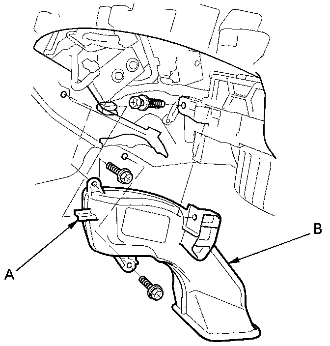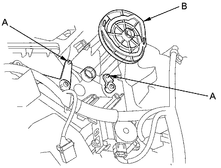 4. Release the wire from its harness clip (A), then remove the self-tapping screws and the passenger's heater duct (B).