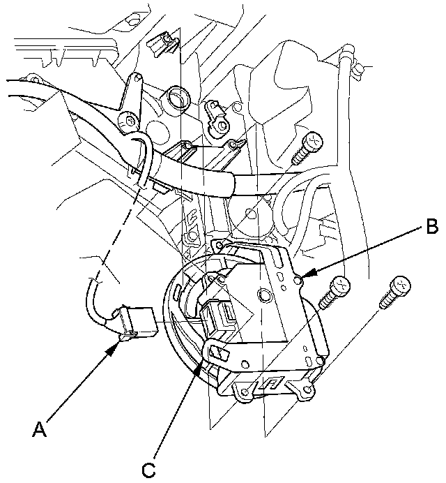 5. Disconnect the 7P connector (A) from the passenger's mode control motor (B). Release the wire from its harness clip (C), then remove the self-tapping screws and the passenger's mode control motor from the heater unit.