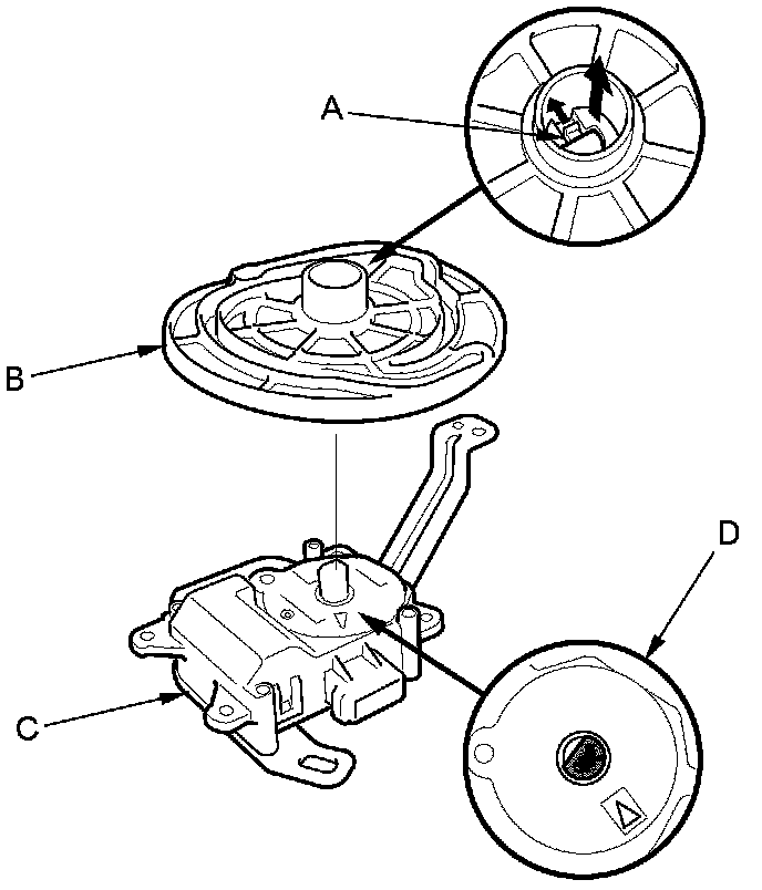 NOTE: Before installing the mode control motor, plug in the 7P connector, and set the passenger's side climate control mode to VENT. Check that the motor output shaft is lined up as indicated (D).