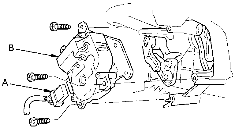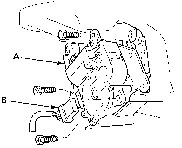 4. Disconnect the 7P connector (A) from the recirculation control motor (B). Remove the self-tapping screws and the recirculation control motor from the blower unit.