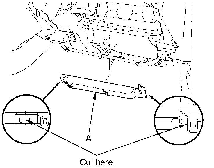3. Cut the plastic cross brace (A) in the glove box opening with diagonal cutters in the area shown. Retain the plastic cross brace to be reinstalled later.
