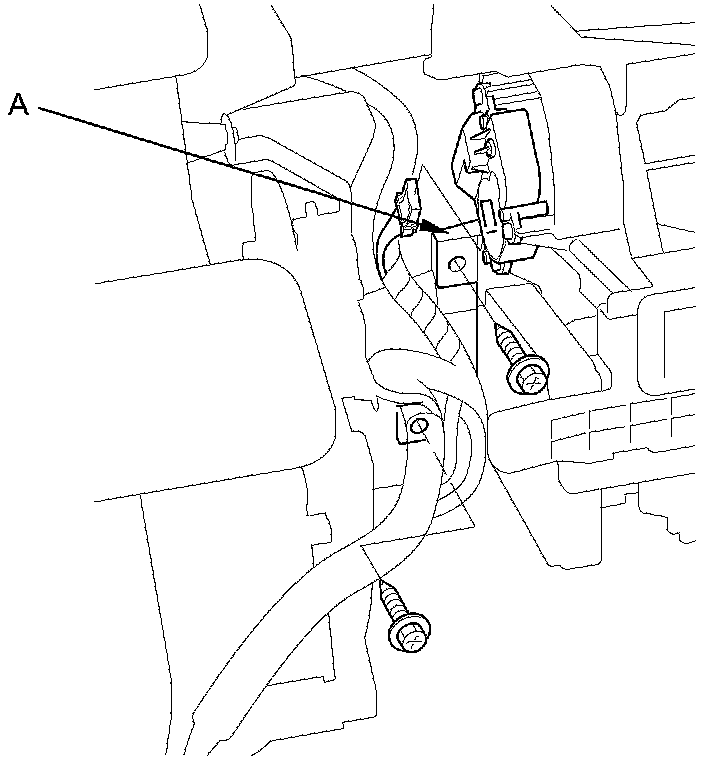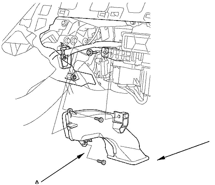 4. Release the wire from its harness clip (A), then remove the self-tapping screws, and the passenger's heater duct (B).