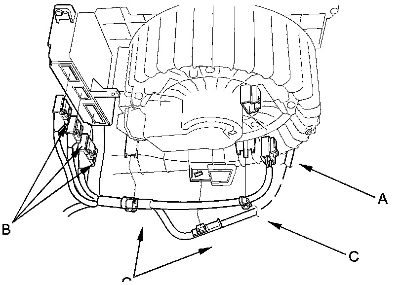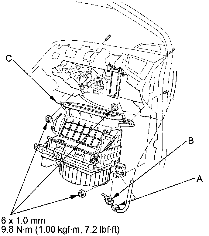 5. Disconnect blower motor connector (A) and climate control unit connectors (B), and detach the wire harness clips (C).