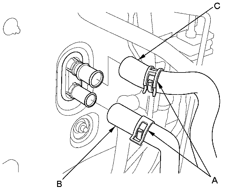 5. From under the hood, slide the hose clamps (A) back. Disconnect the inlet heater hose (B) and the outlet heater hose (C) from the heater unit. Note the layout of the hoses.