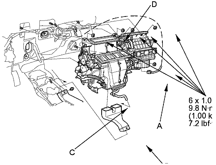 8. Disconnect the right engine compartment wire harness connector (C201) (A). Remove the duct (B), and the drain hose (C). Then remove the mounting nuts, and the blower-heater unit (D).